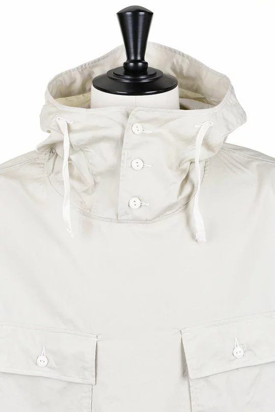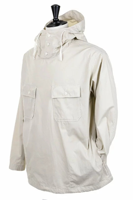 The Cagoule Shirt by Engineered Garments is a simple pop over, hooded smock. Made up in a Superfine Cotton Poplin the Pop Over features a three button funnel collar, drawcord hood, two chest pockets with flap and button, two side hand pockets and a drawcord straight across hem.