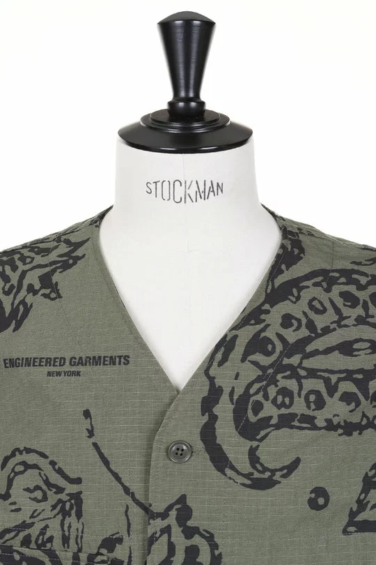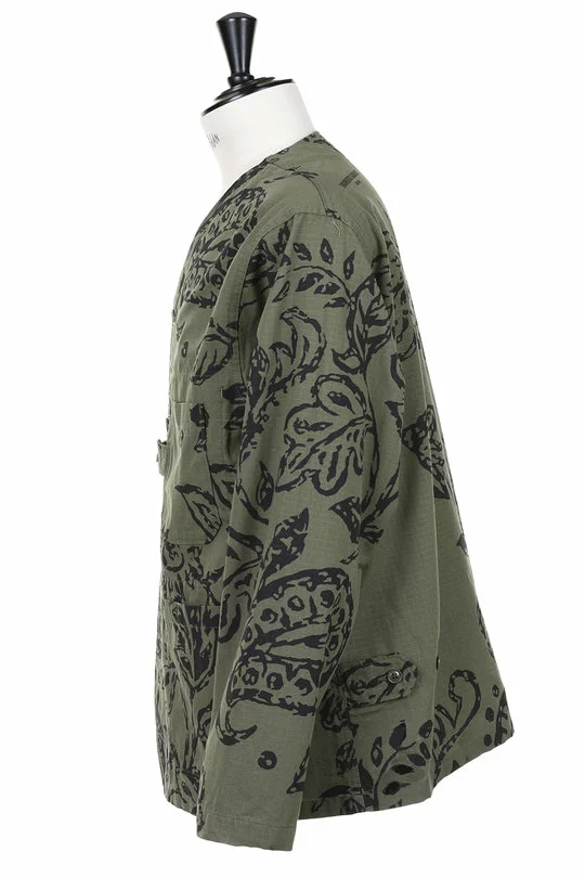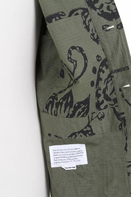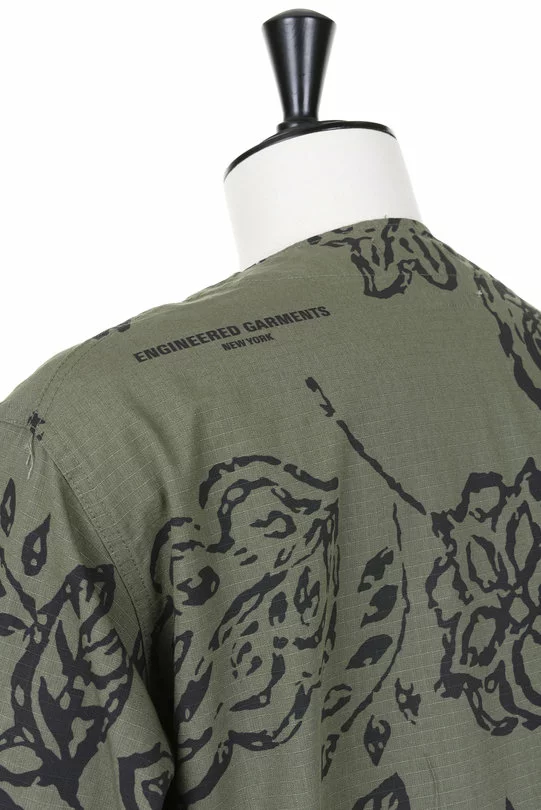 The Cardigan Jacket Floral Print Ripstop by Engineered Garments is a simple “V” collar Coverall style. Made up in an EG Floral Print Ripstop Cotton the jacket includes a four button front fasten, four frontal patch pockets, a binocular strap secure and a single internal stow pocket.