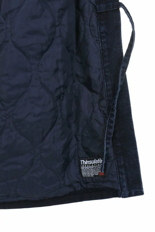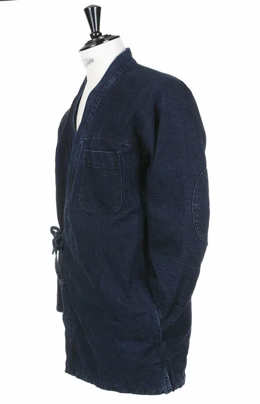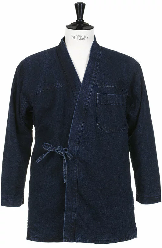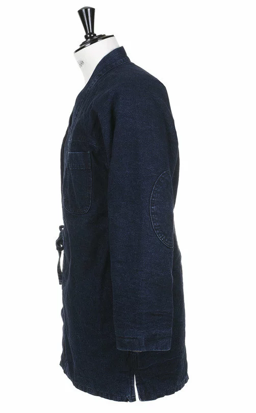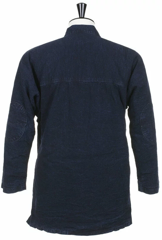 The Dotera Jacket by Snow Peak is slight quilted, Kimono style jacket. The jacket is made up in a heavy Indigo Dyed Japanese Cotton Oxford and has a fully insulated lining. It also features a double tie fasten,two handwarmer pockets, a single chest pocket and reinforcement patches at the elbows.