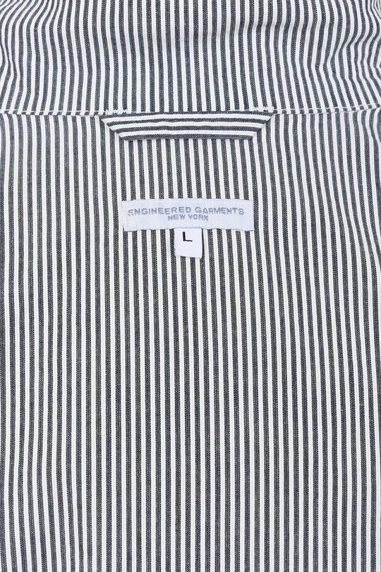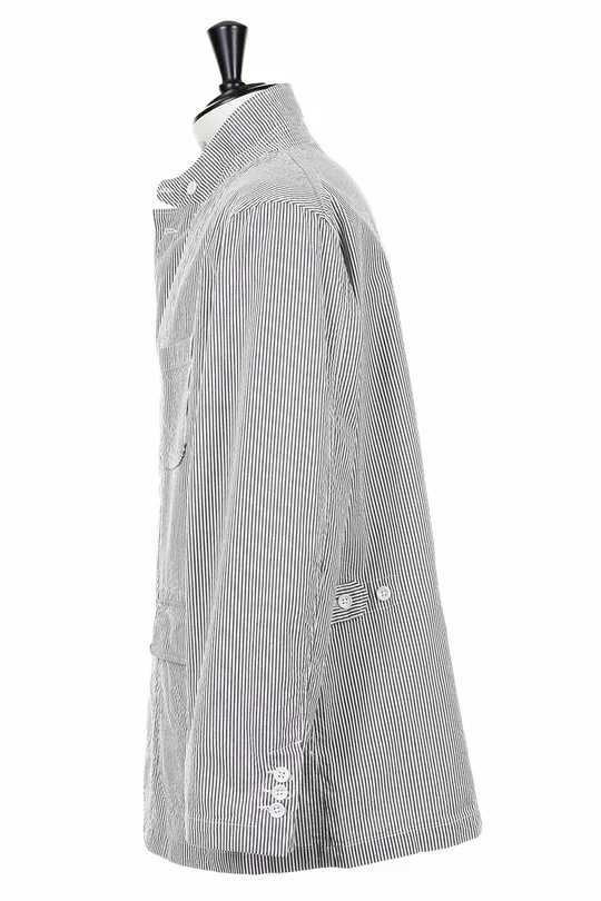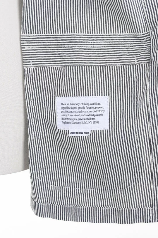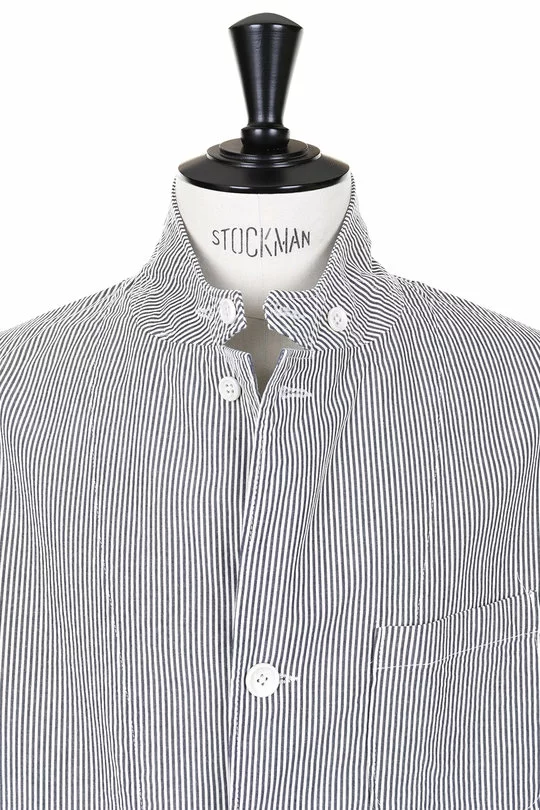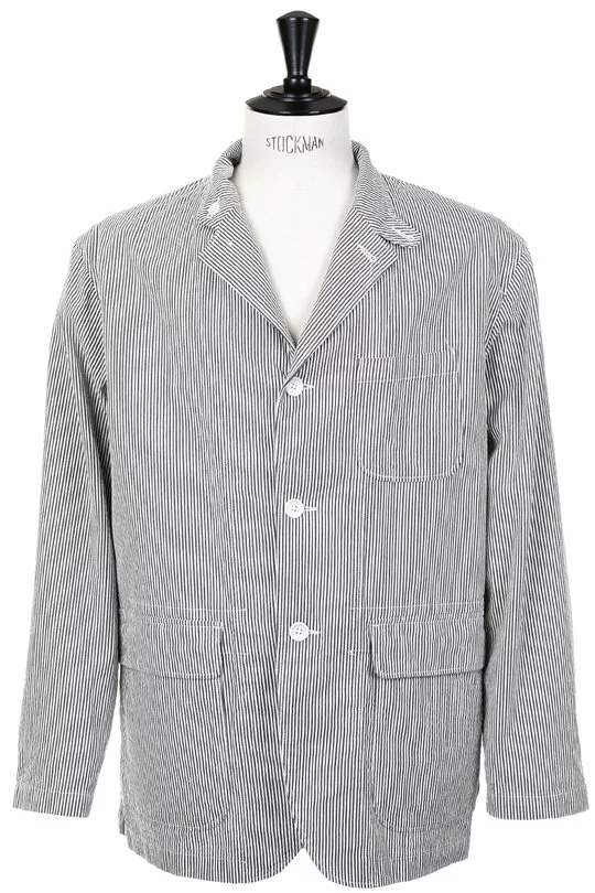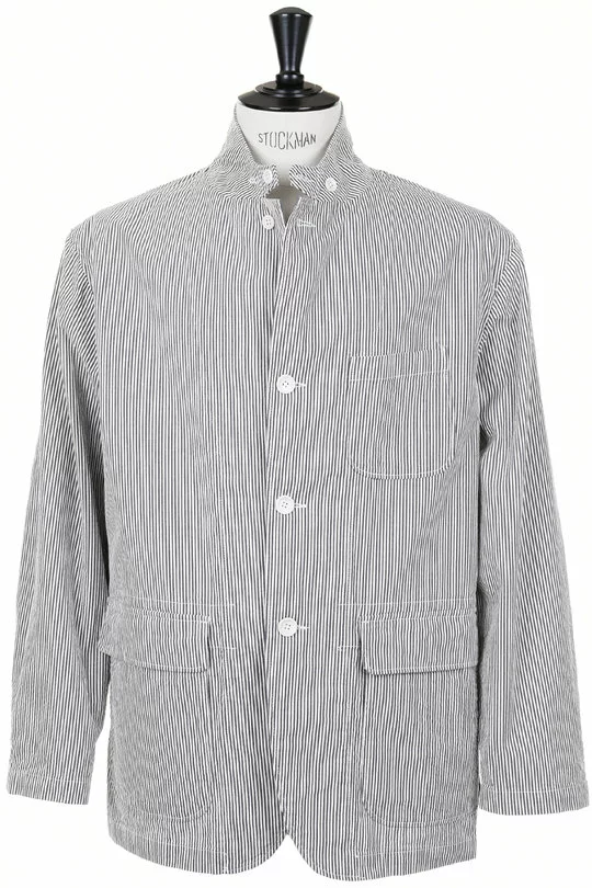 The Loiter Jacket Seersucker Stripe by Engineered Garments is a super relaxed sport coat. Made up in classic Summer Seersucker the jacket features a three button front, storm tab button collar, single chest pocket, two lower patch pockets with flaps, strap and button side adjusters and working cuffs.