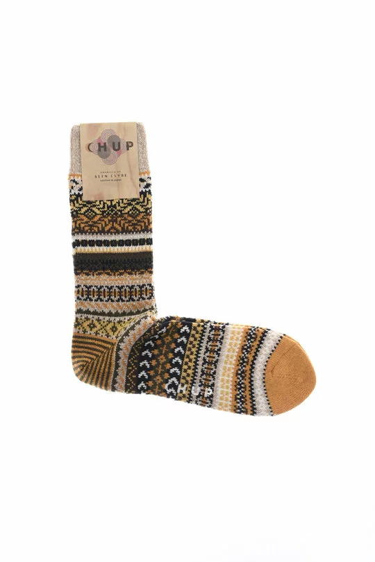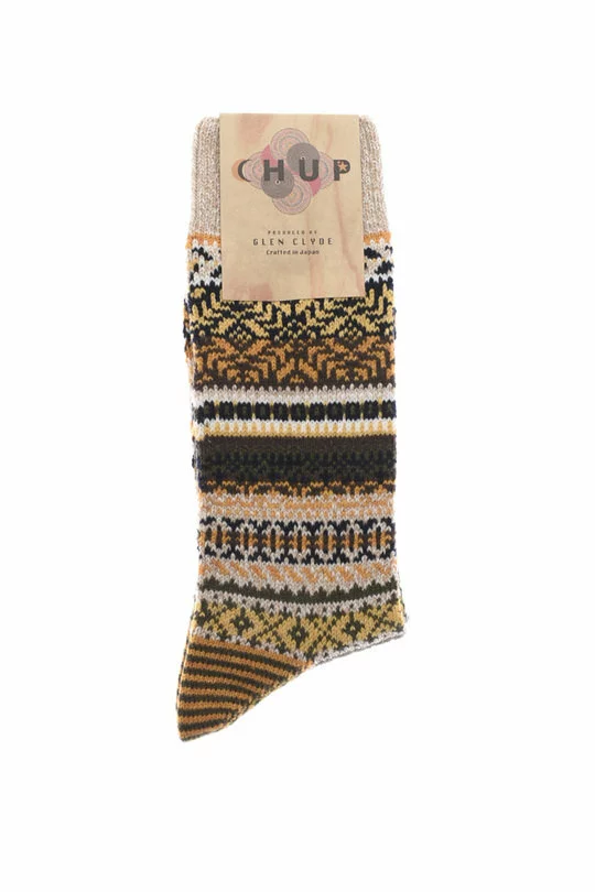 Chup socks are made by Japanese textile experts Glen Clyde. Handmade in Japan by expert craftsmen, the attention to detail is remarkable. Made from the finest textiles, the Lumimesta is a crew style with a Jaquard knit pattern and a hand linked toe.