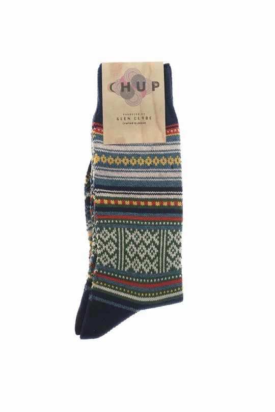 Chup socks are made by Japanese textile experts Glen Clyde. Handmade in Japan by expert craftsmen, the attention to detail is remarkable. Made from the finest textiles, the Pano is a crew style with a Jaquard knit pattern and a hand linked toe.