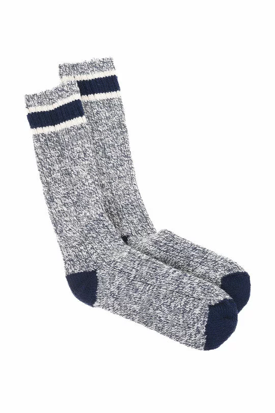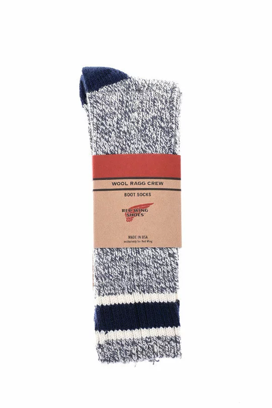 The Wool Rag Socks by Red Wing made up in a mixed Wool and Re Cycled Cotton yarn the socks also feature a ribbed cuff and striped cuff.