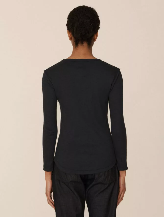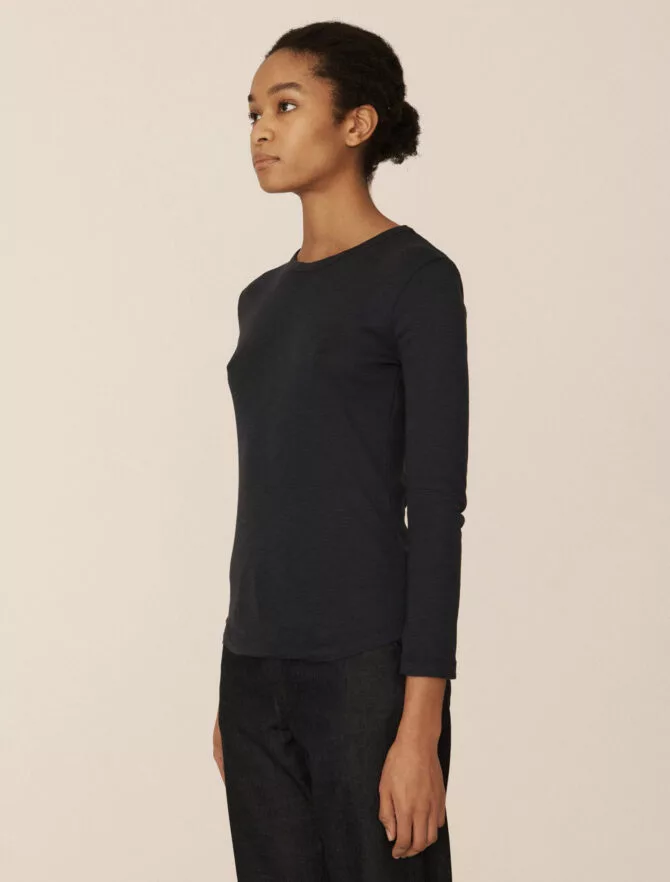 T-shirt a maniche lunghe a costine dalla linea aderente. In cotone organico fiammato tinto in capo con impunture stile baseball.
