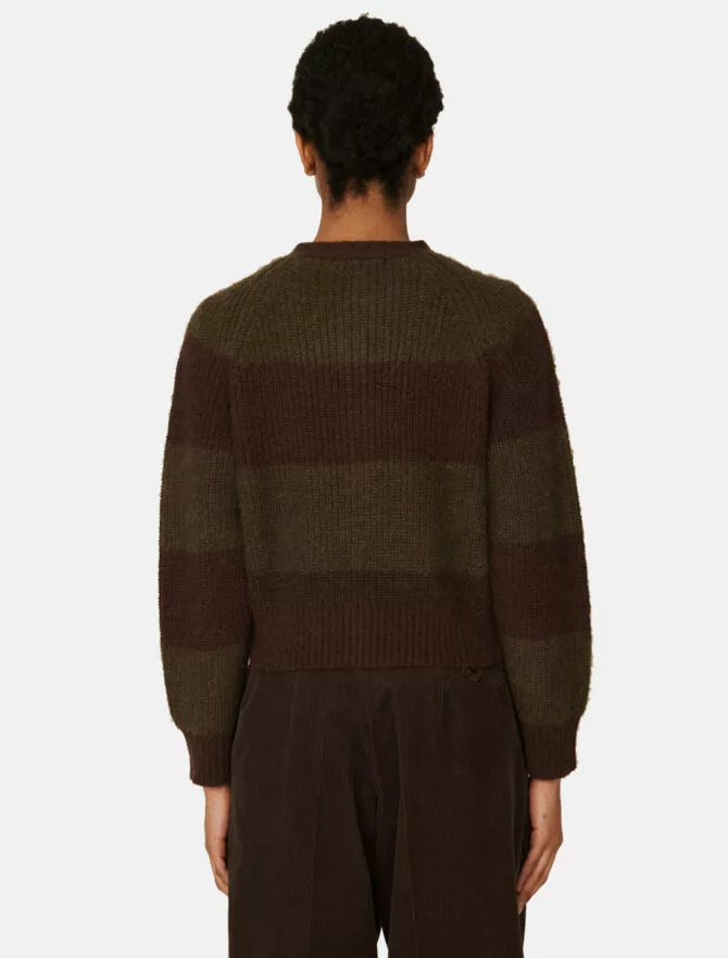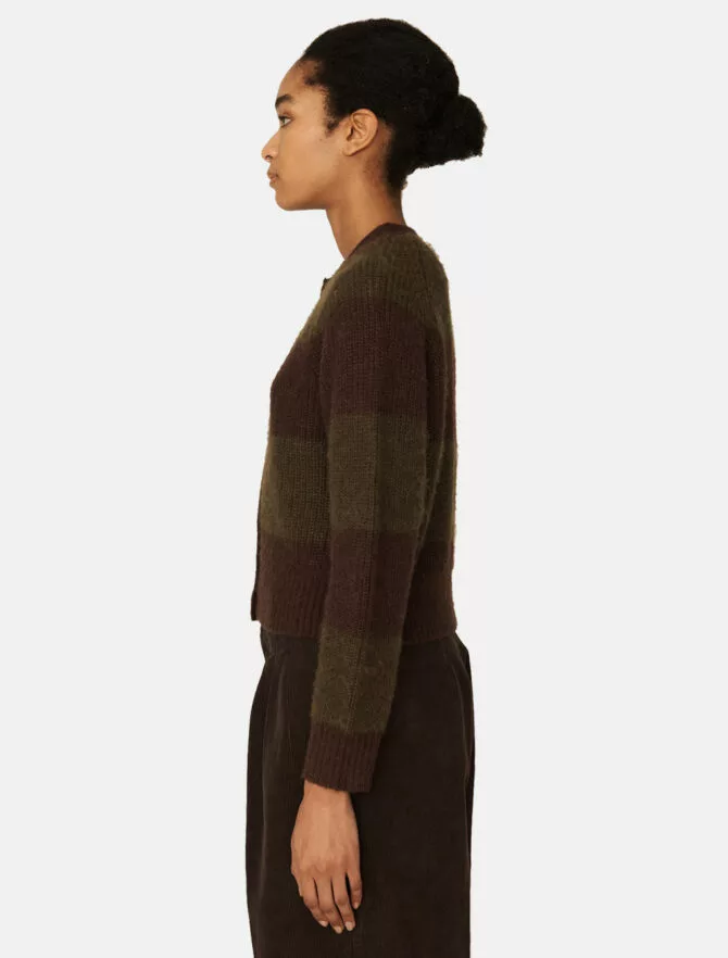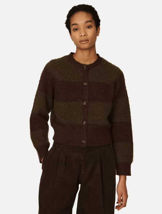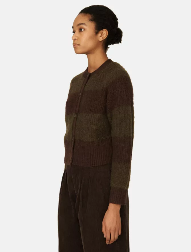 Cardigan corto a righe multicolori, realizzato in un leggero misto lana mohair.